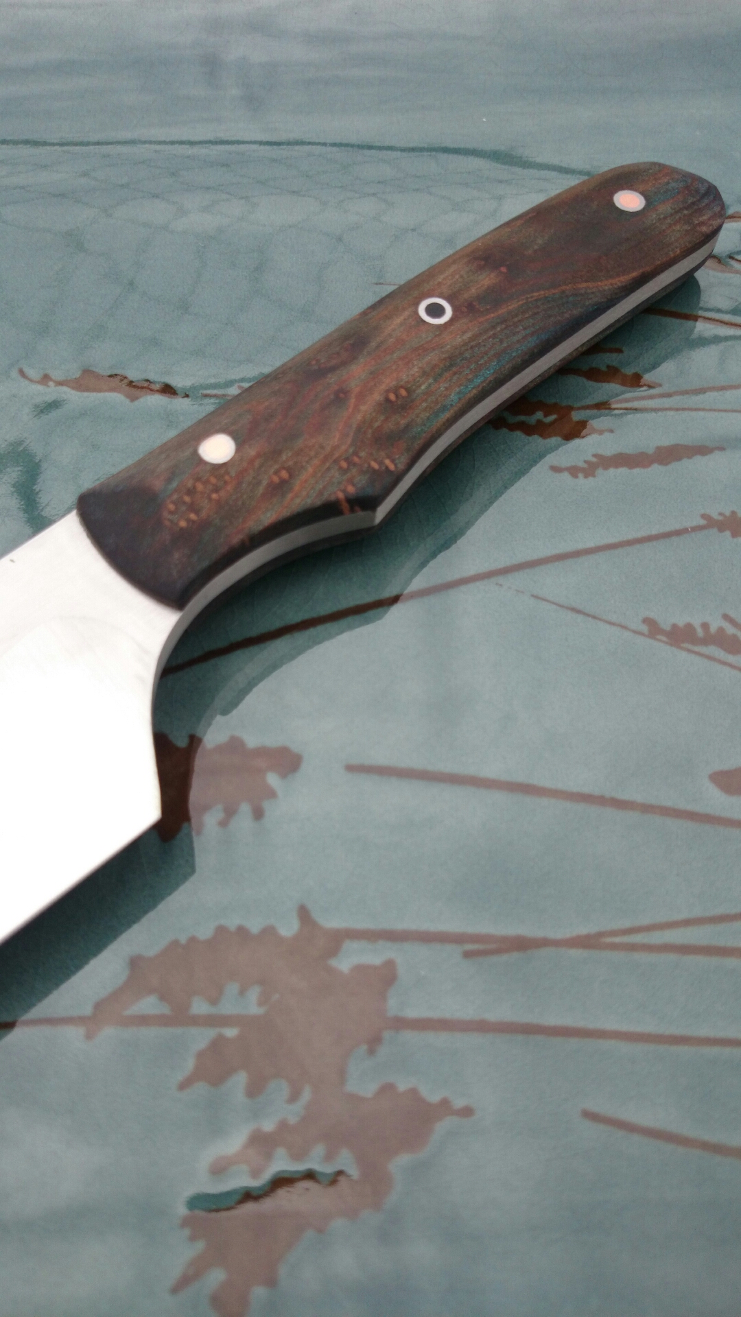 CPM 154 steel 5/32″ thick. Handle is dyed, and stabalized redwood burl. With stainless, copper, and carbon fiber pins.