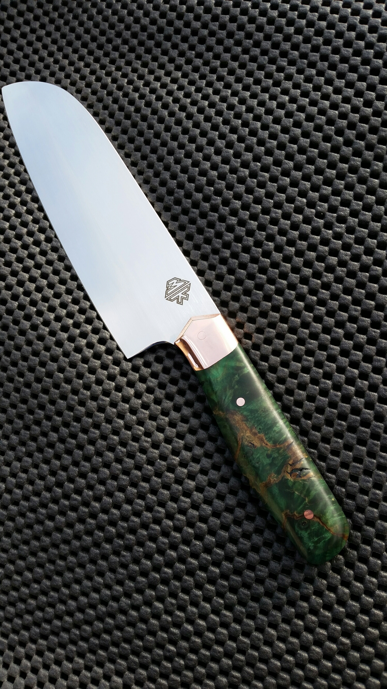 Green dyed box elder burl copper pins and bolsters on a hand rubbed satin finished AEB-L Blade