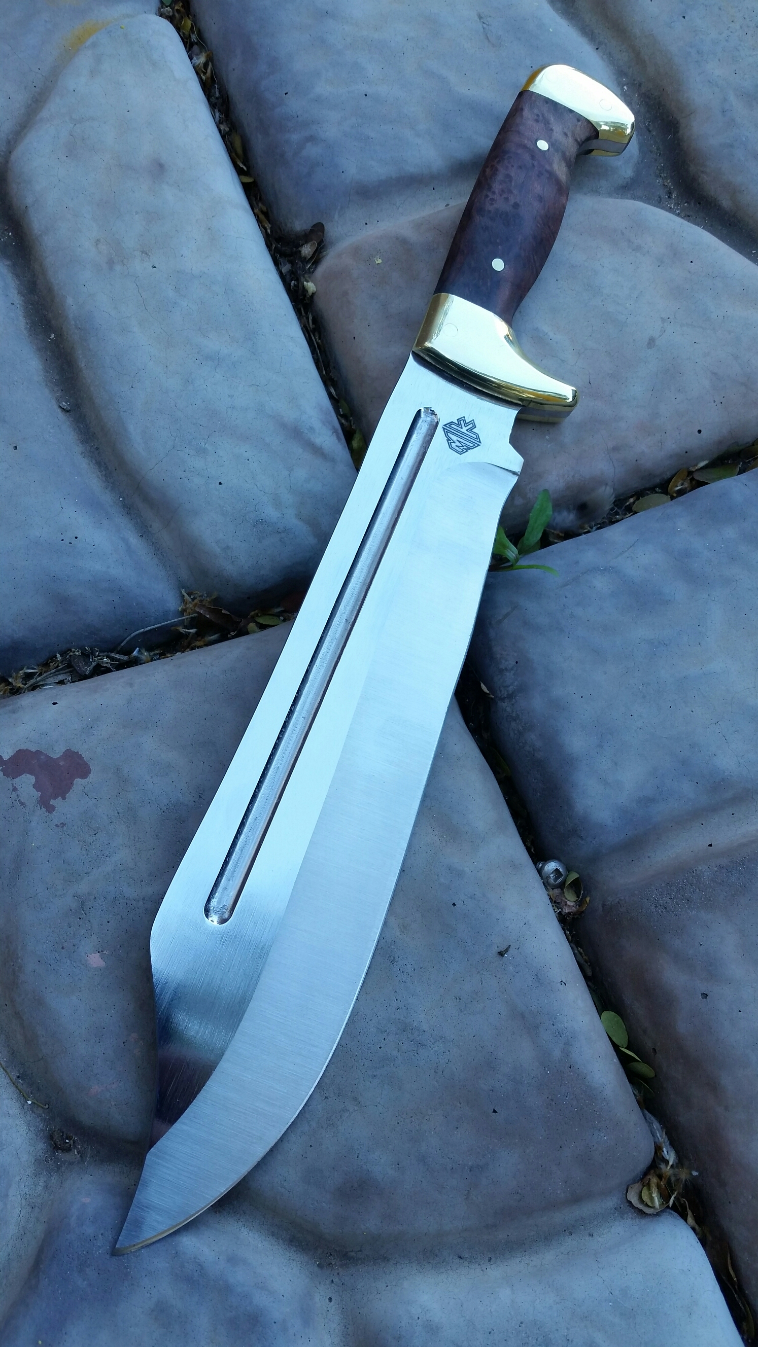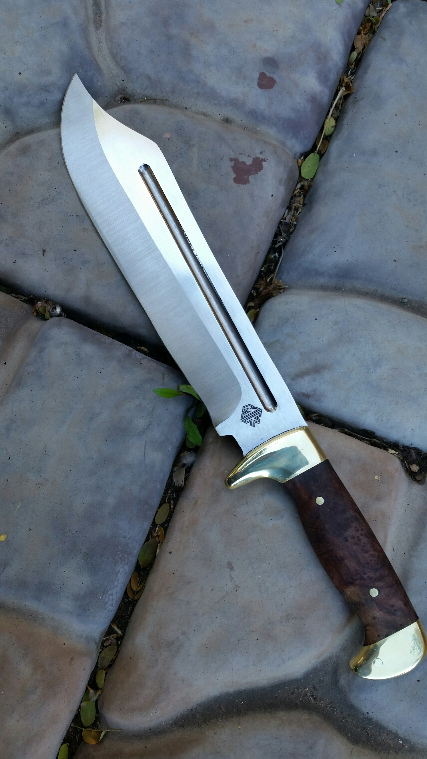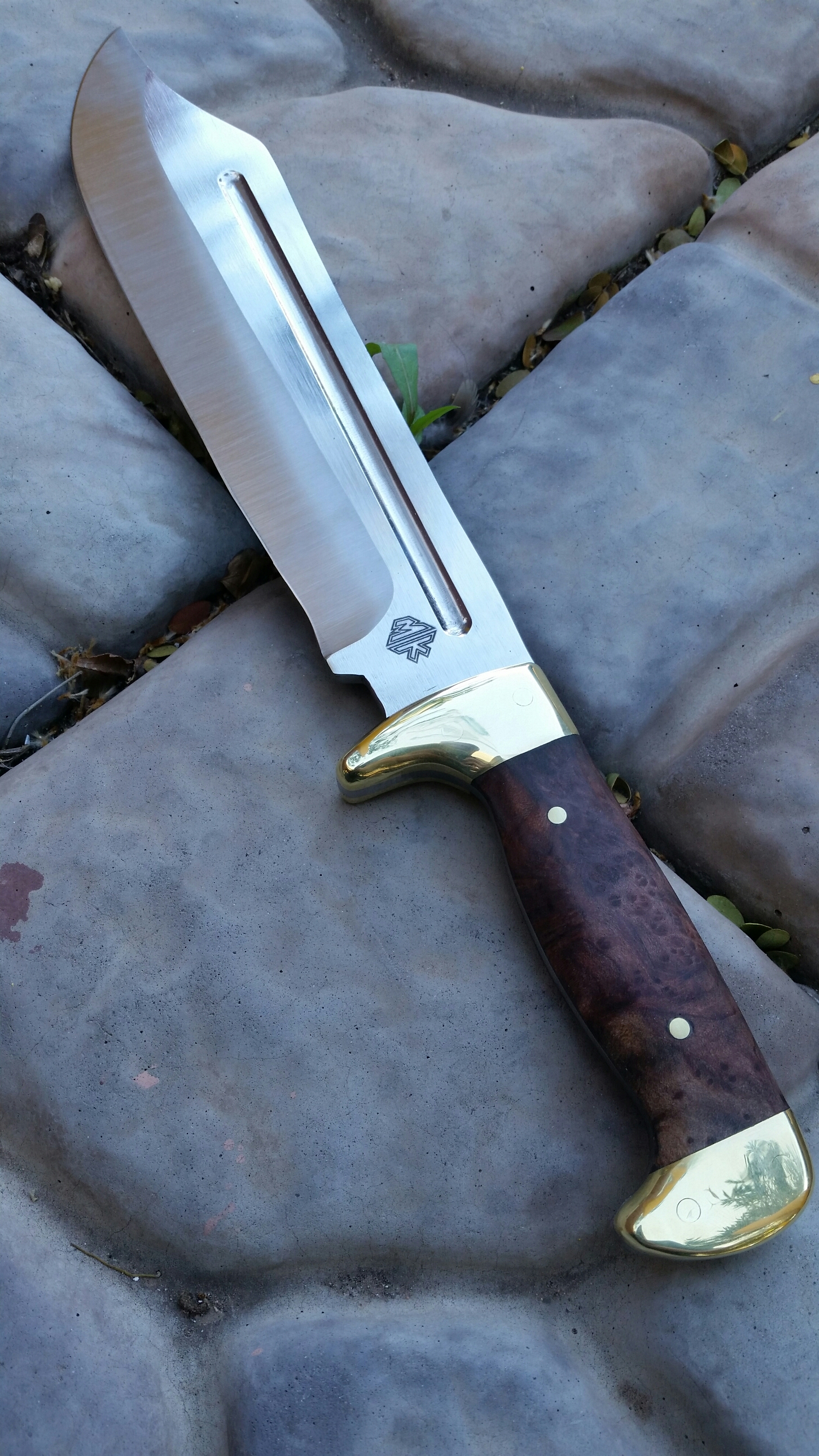 N690 steel, brass bolsters and pins, redwood lace burl wood.