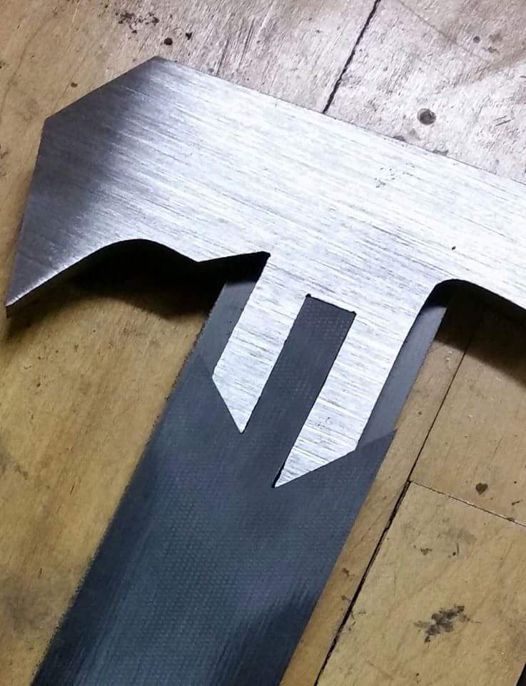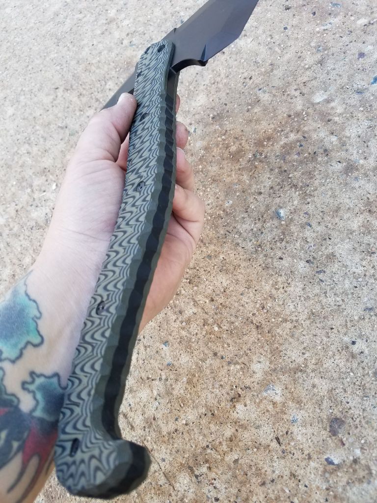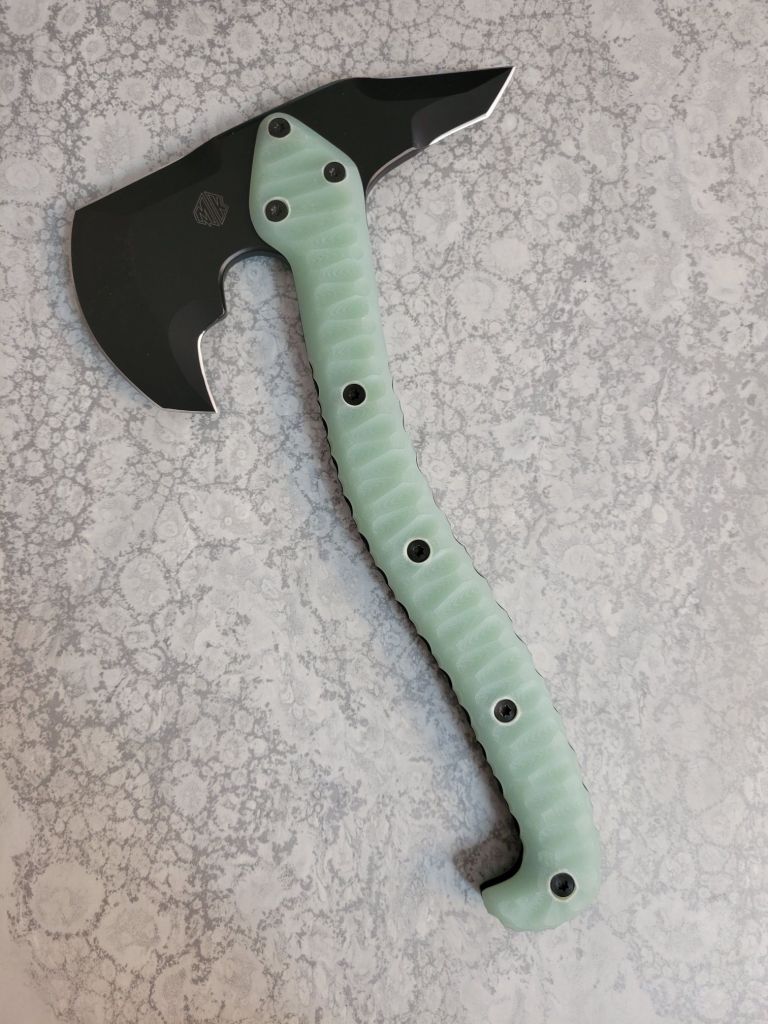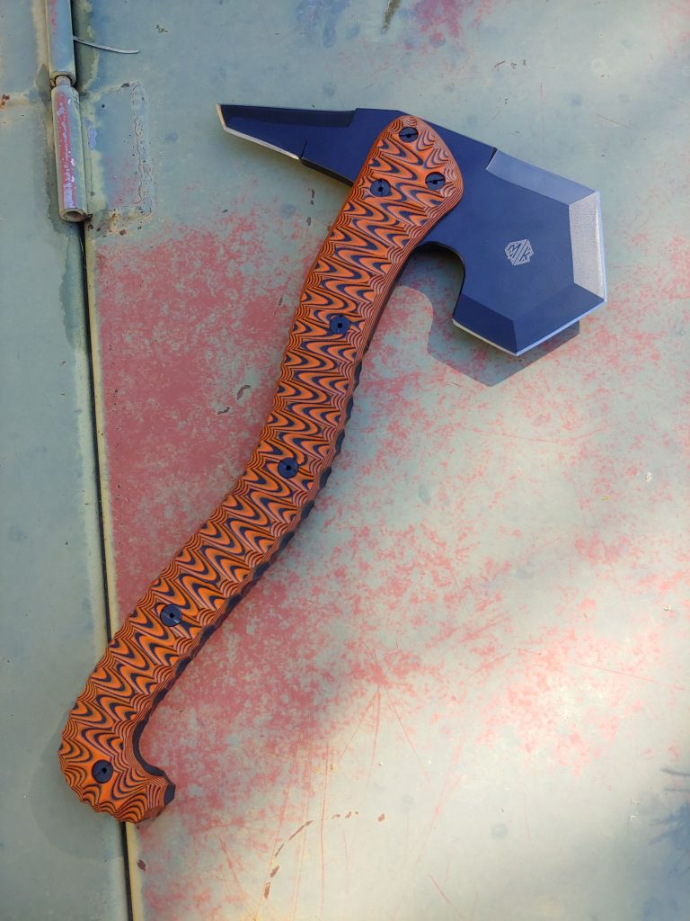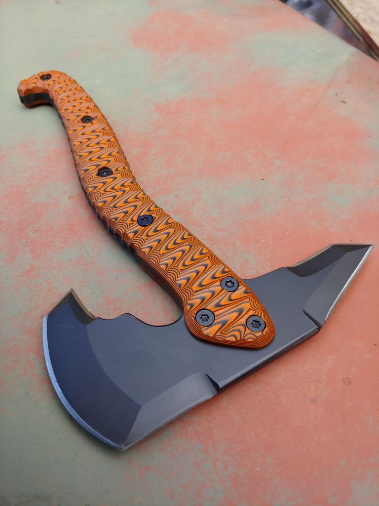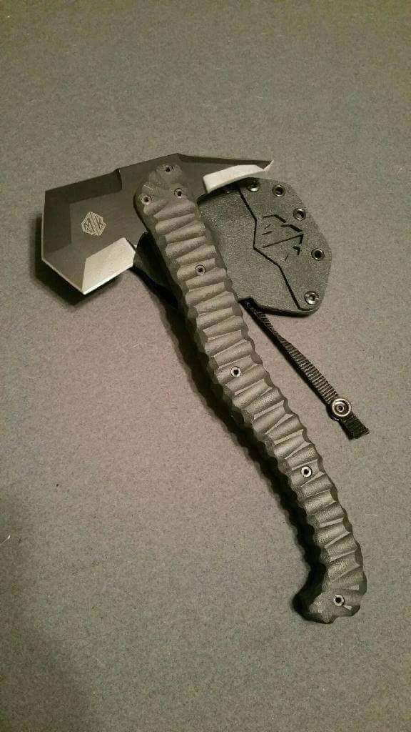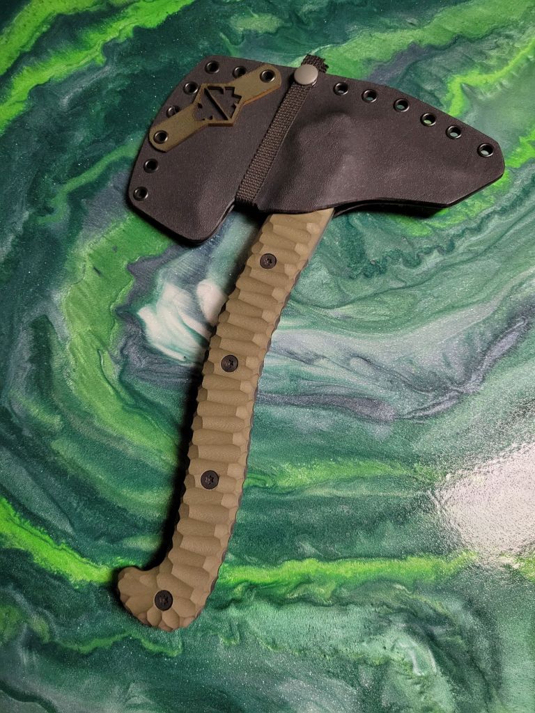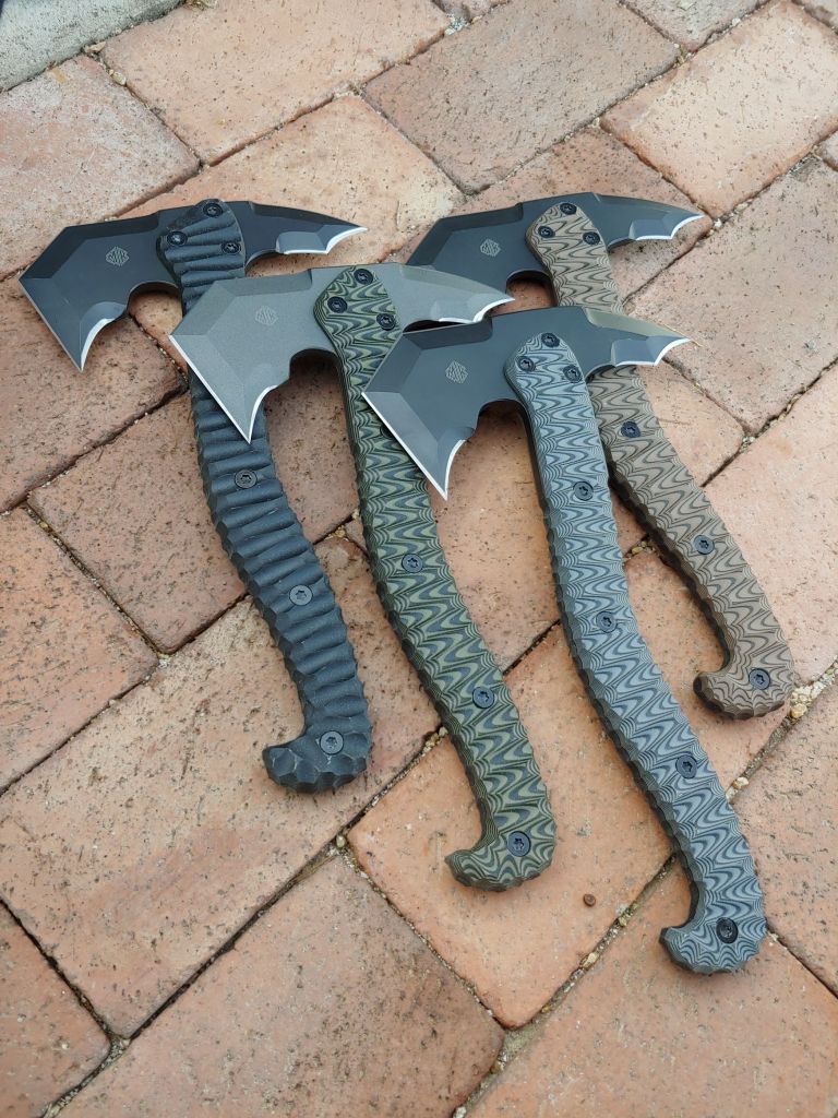 The Tomahawks are 12″ overall with a 3 piece g10 handle. 4 head styles available. The head made of .25″ thick 80crV2 steel thats interlocked, sandwiched and bolted to the handle. This makes for a perfect weight distribution. They include the kydex cover with a snapping safety strap. $525.