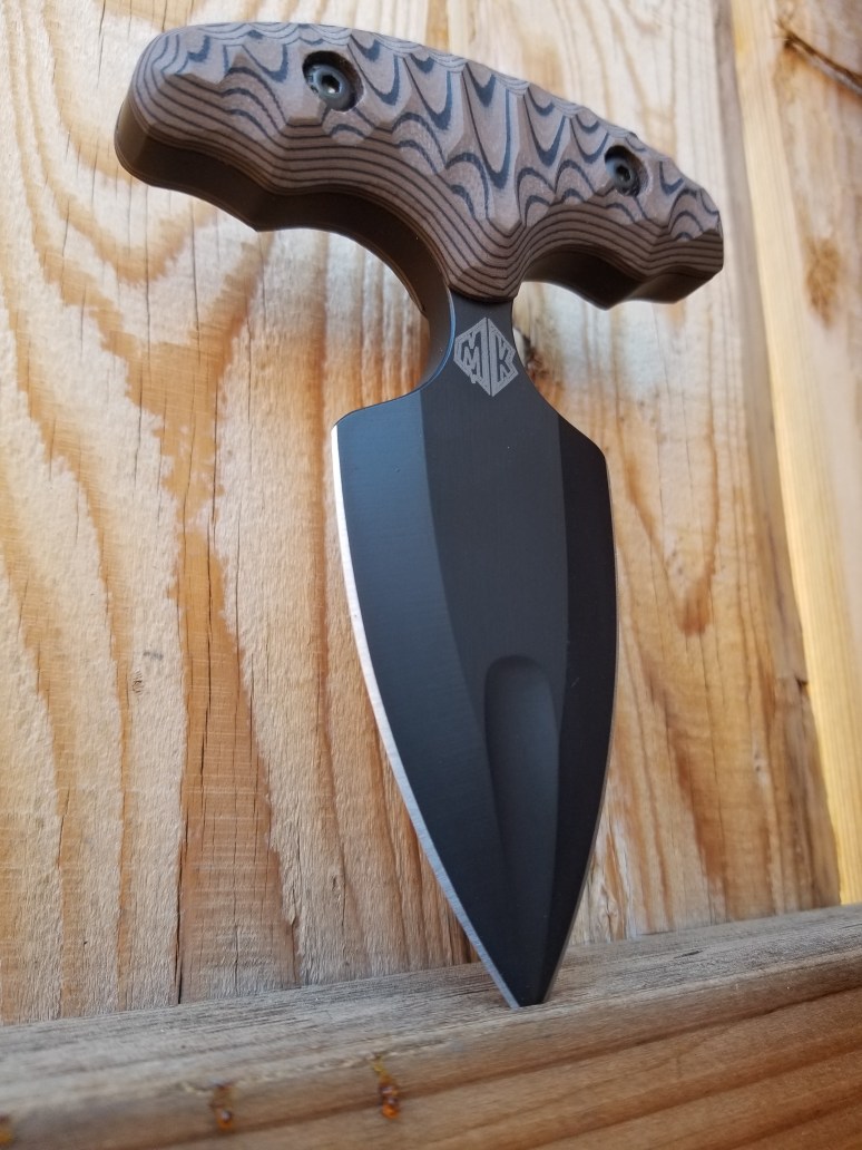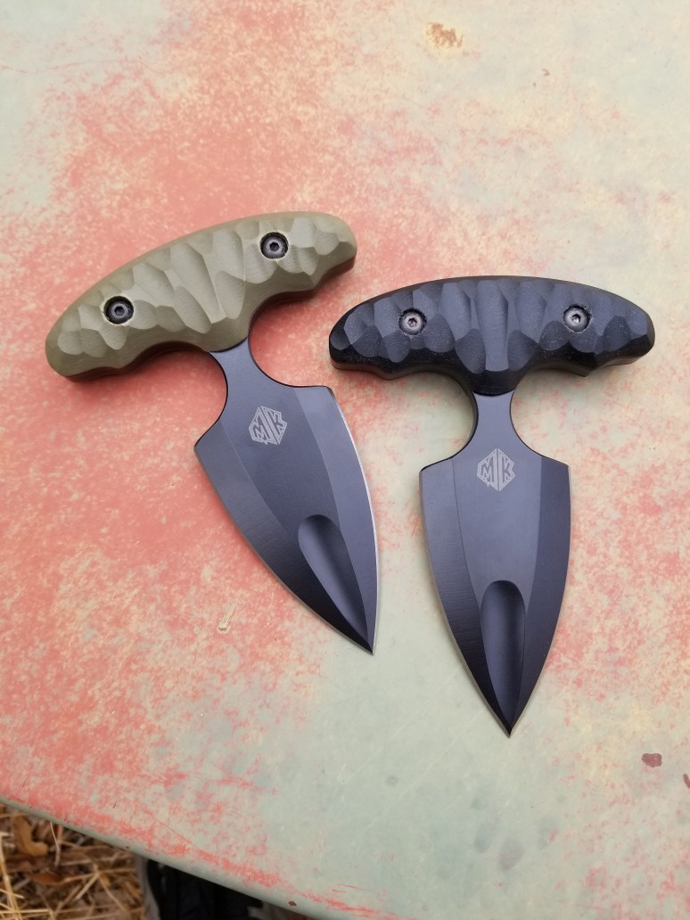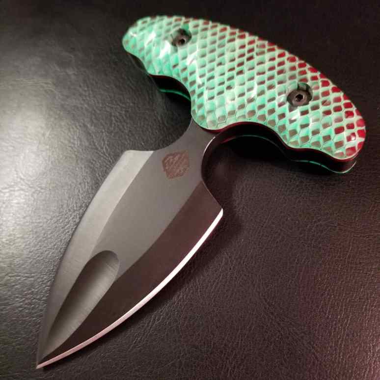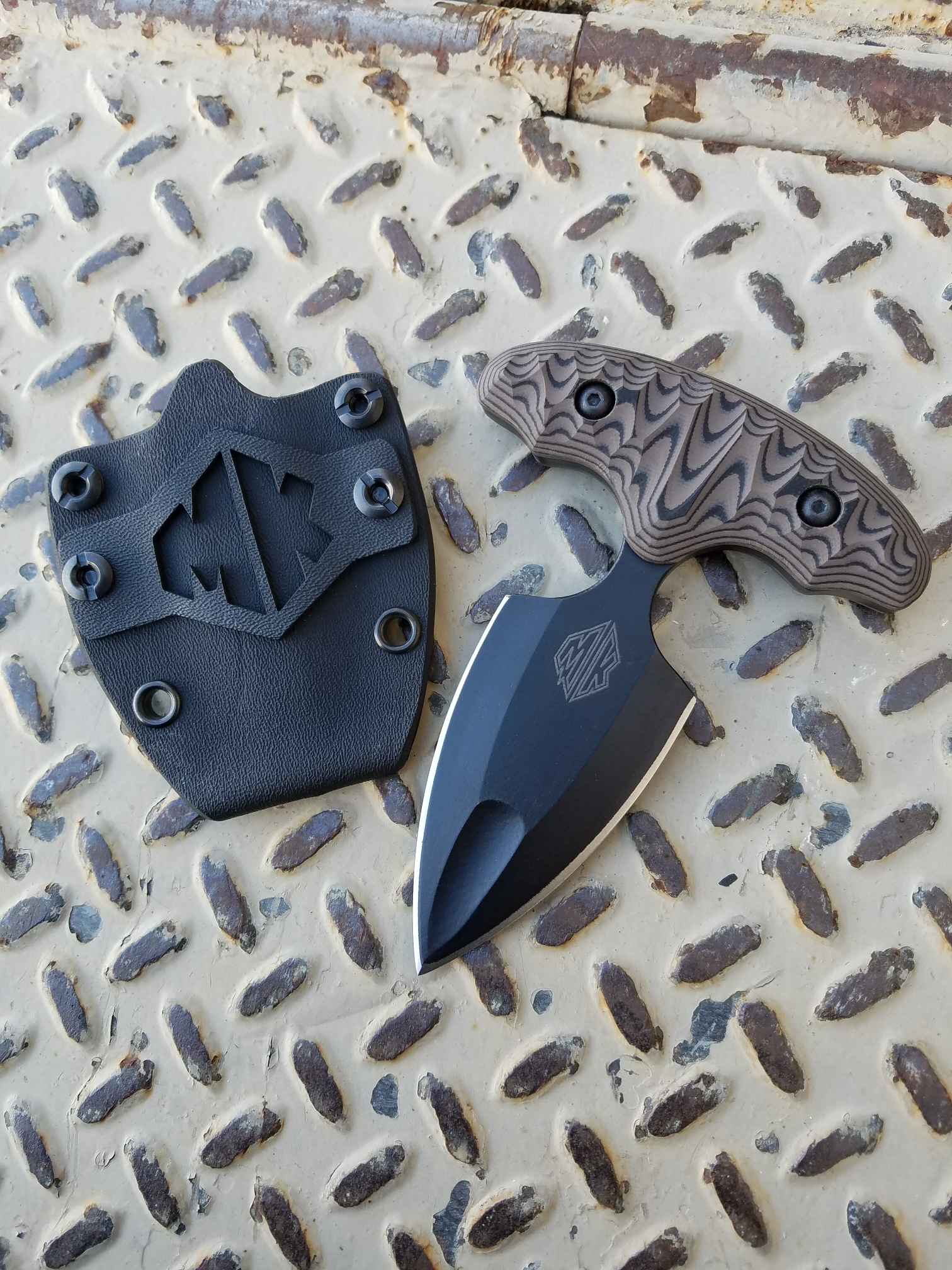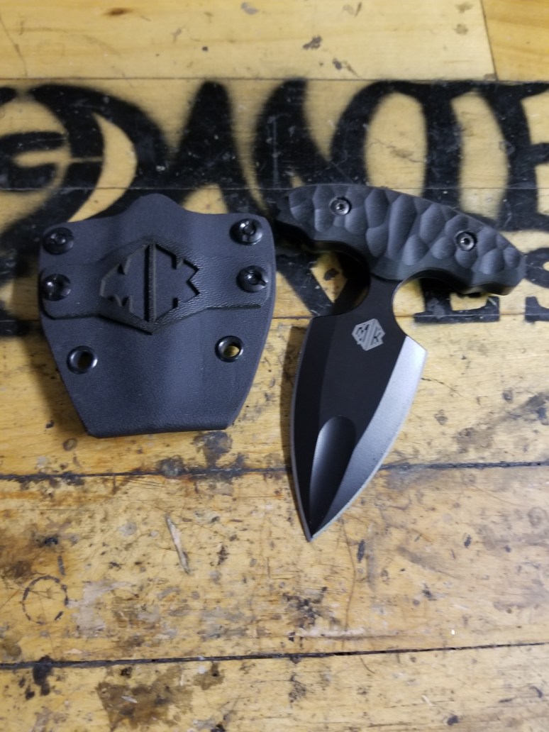 Made of .25″ thick 80crV2 steel with a cerakote finish . It comes with any color g10 handles, and includes the kydex sheath for $250. plus shipping. Handle and steel upgrades are available. Contact for ordering.