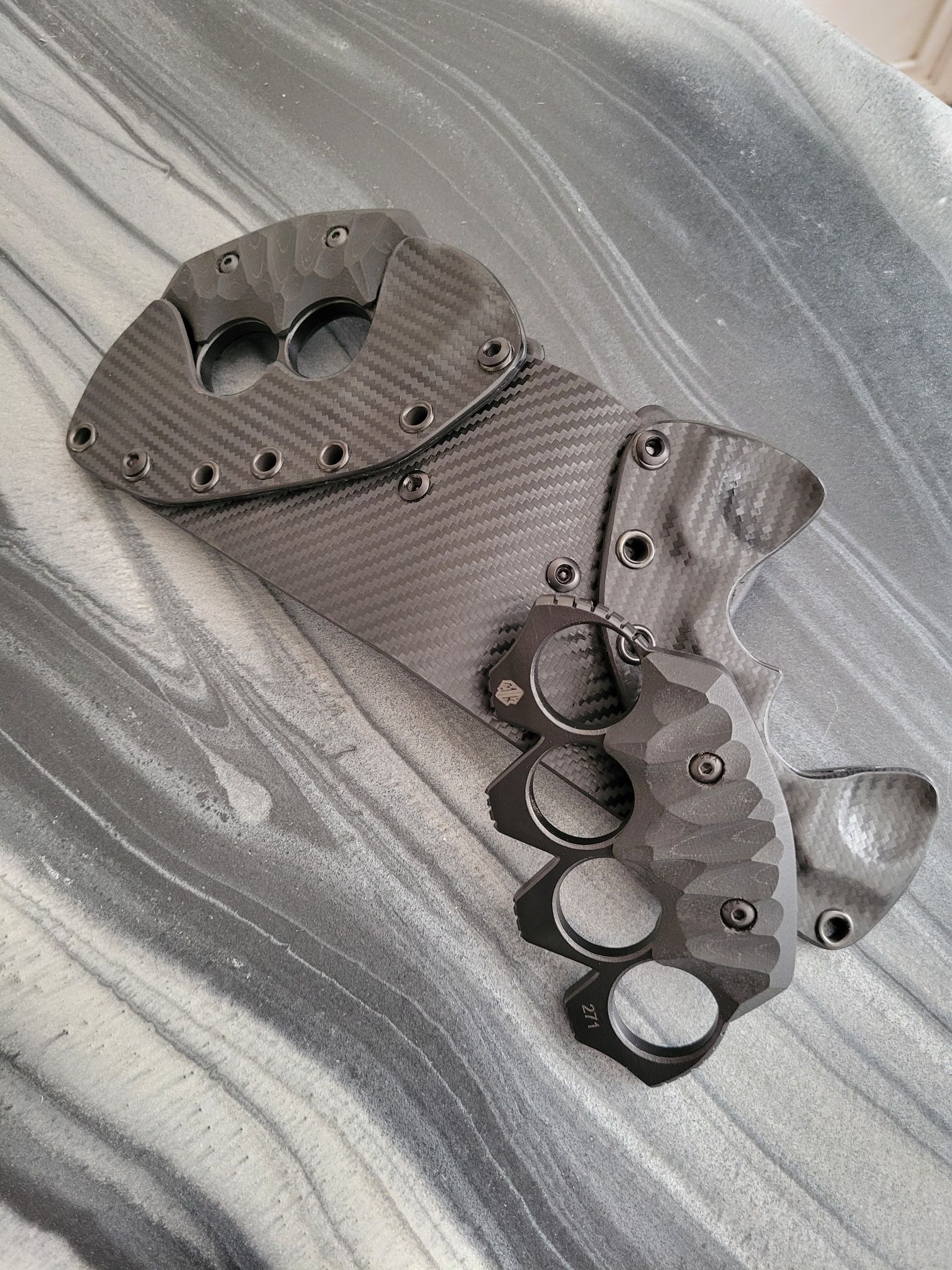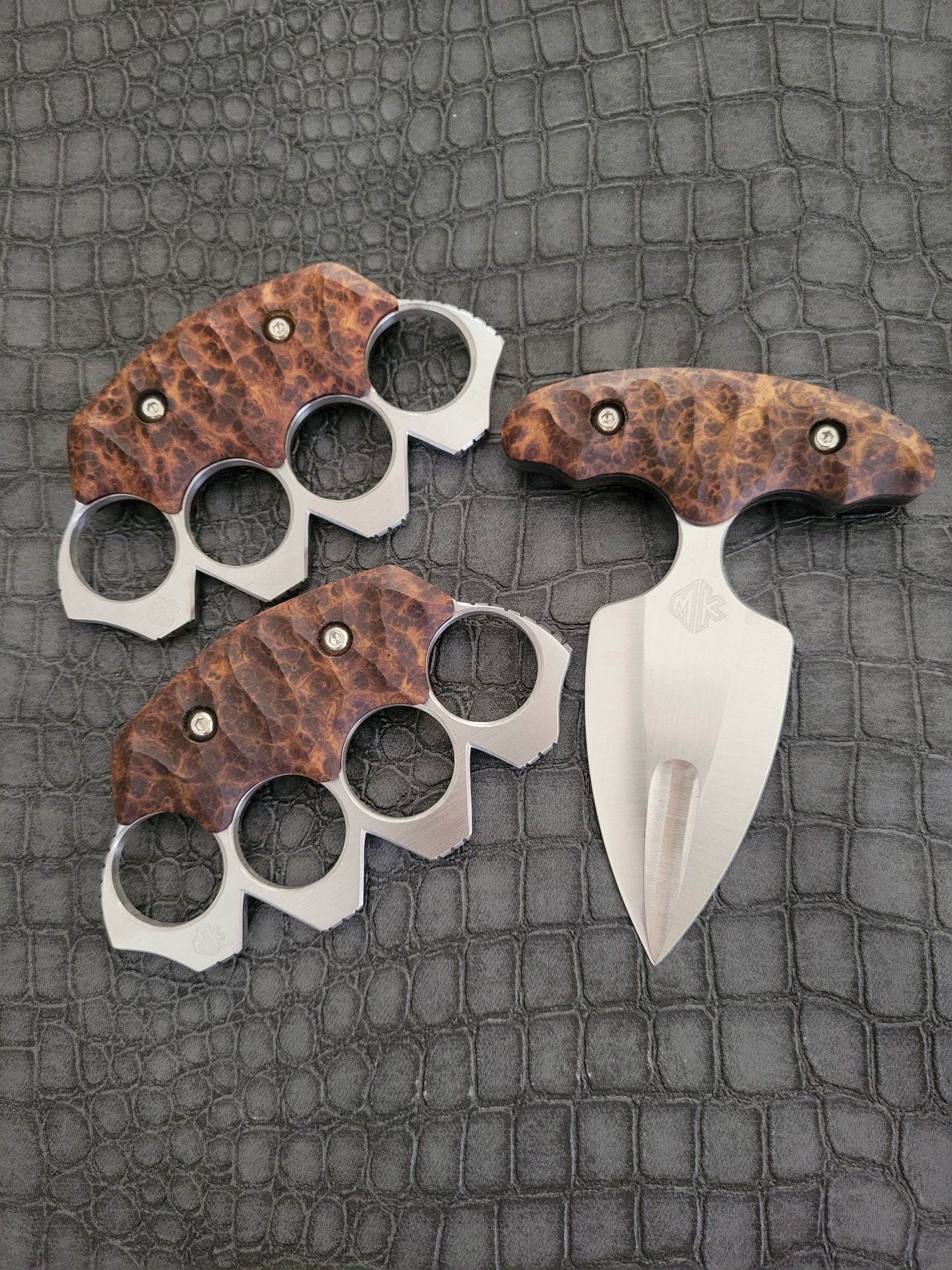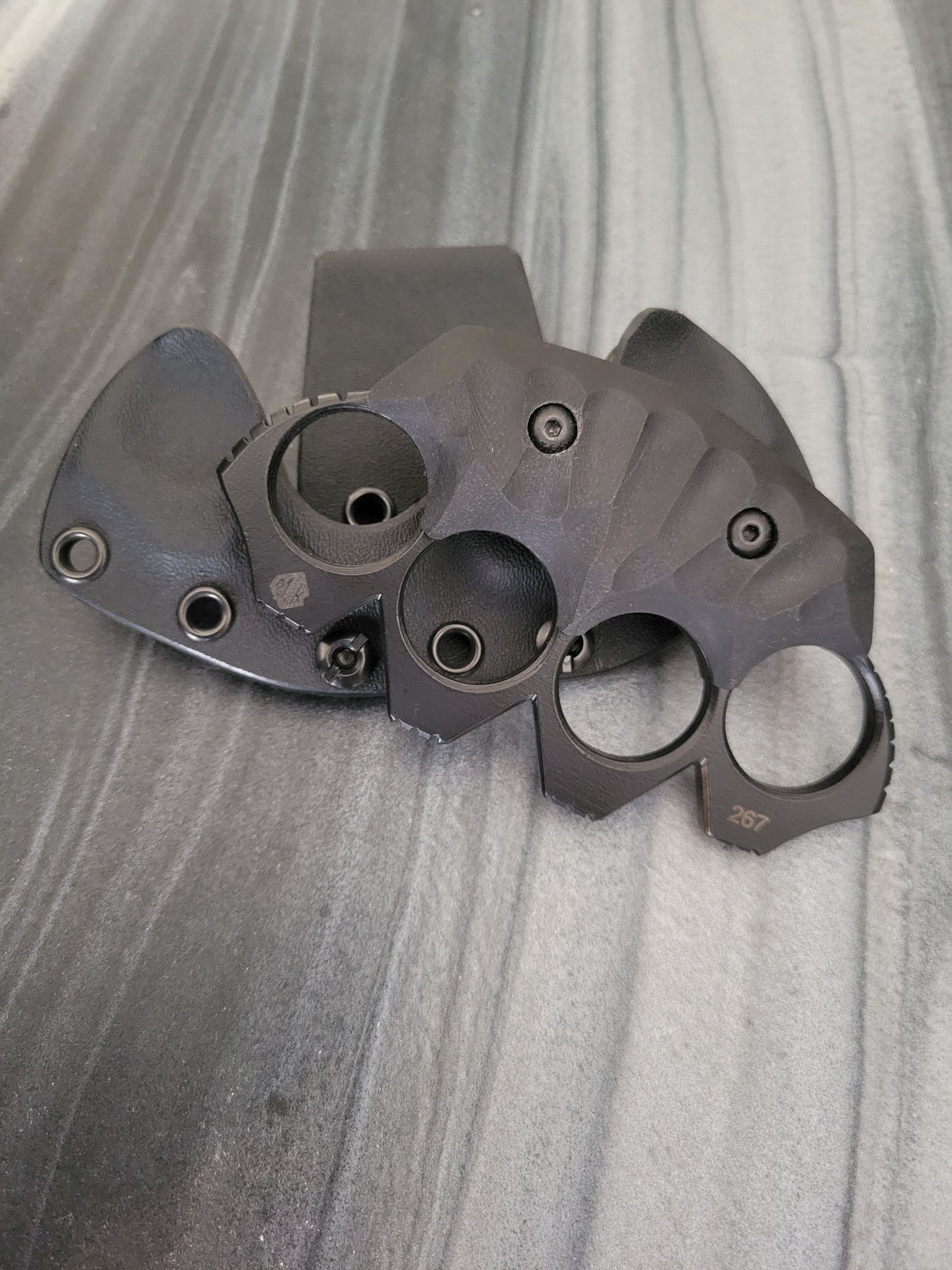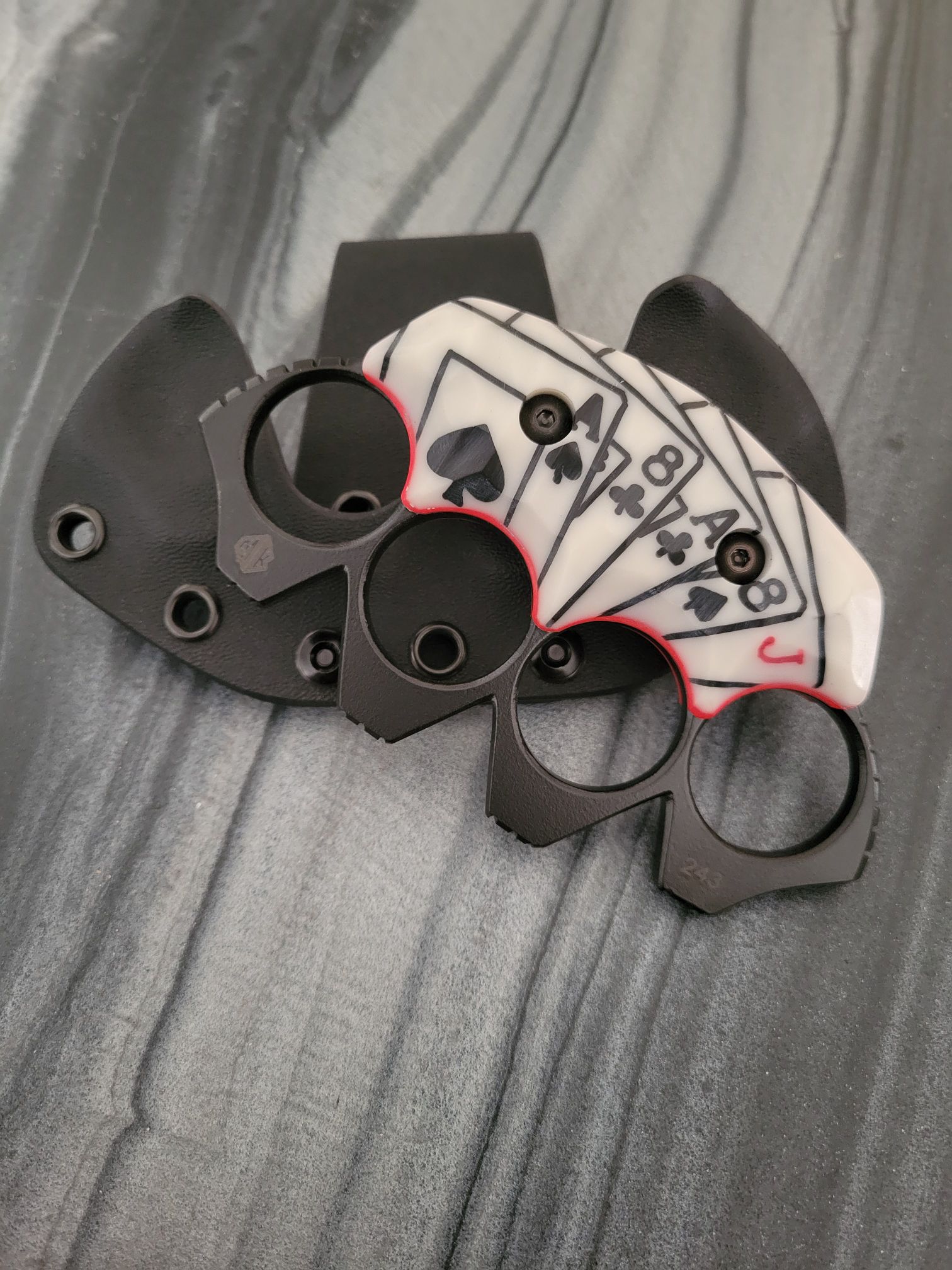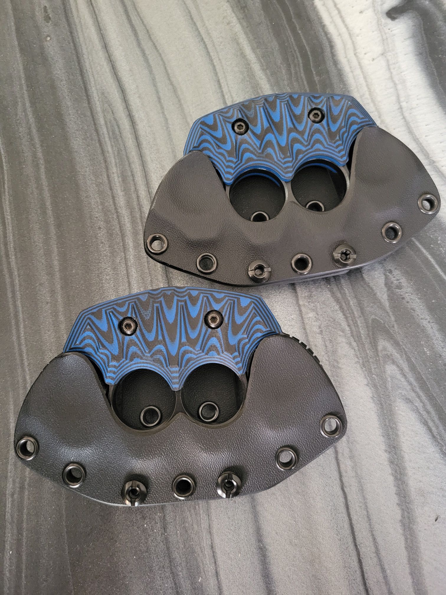 MCKNUCKLES ARE SOLD ONLY INSIDE THE CONTINENTAL US.McKnuckles are made of .25″ thick steel with a cerakote finish. It comes with any color g10, and includes the kydex sheath for $260 plus shipping. Customizations and material upgrades are available.