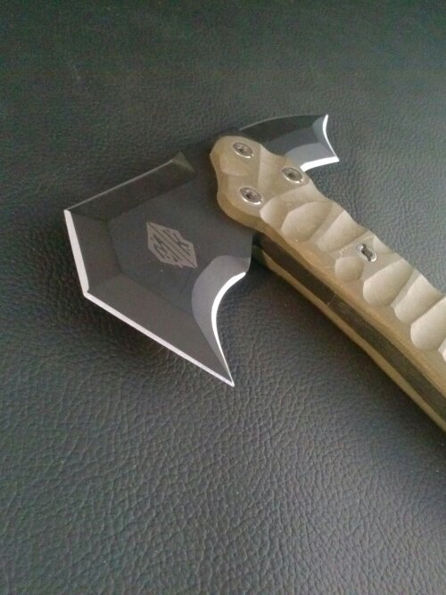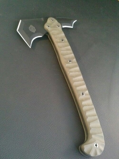 Coyote tan g 10 handle, black g10 tang. Desert sage cerakote on a 5160 head. 12″ overall, 6″ across head, 2.5″ tall head.